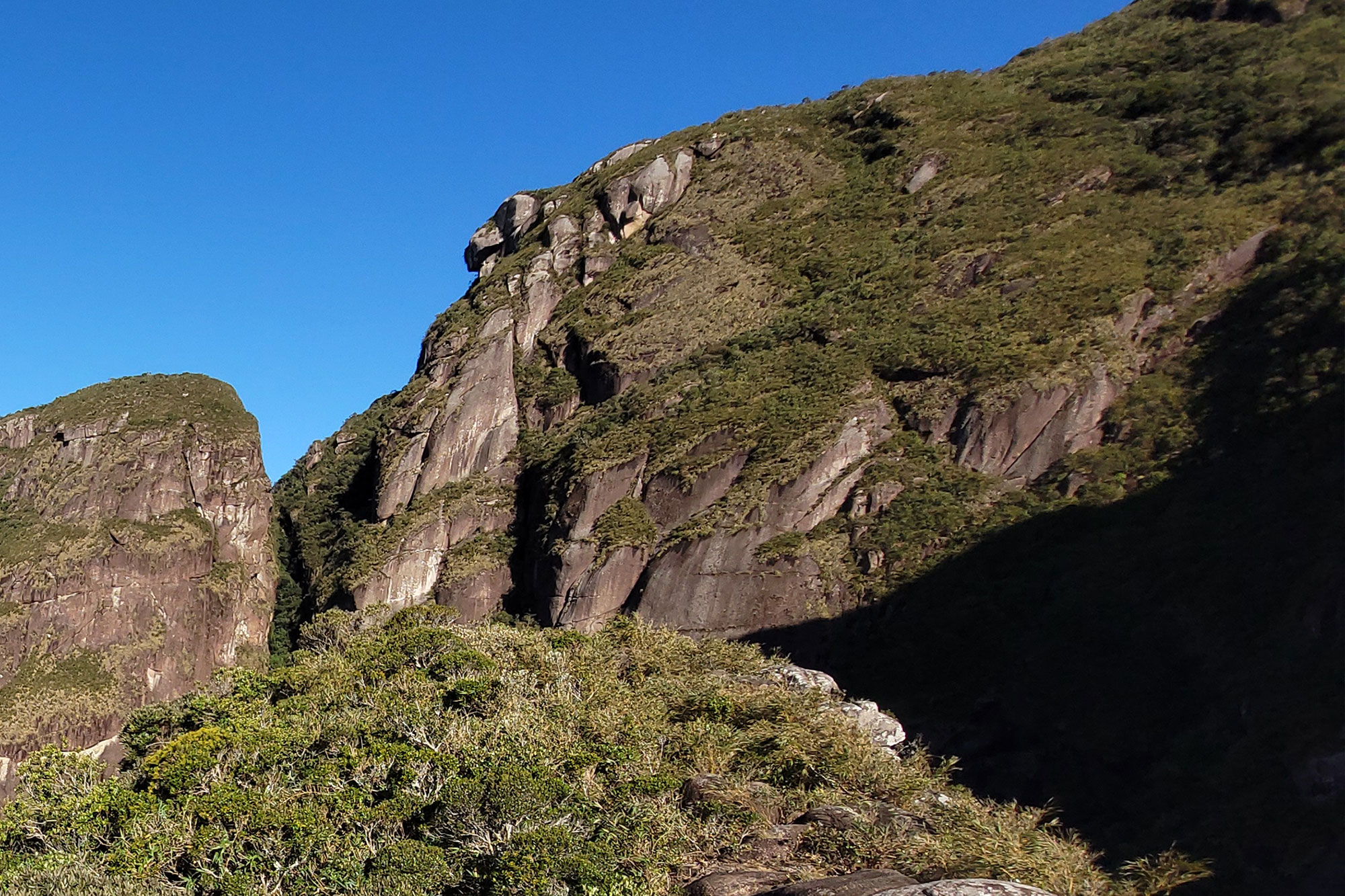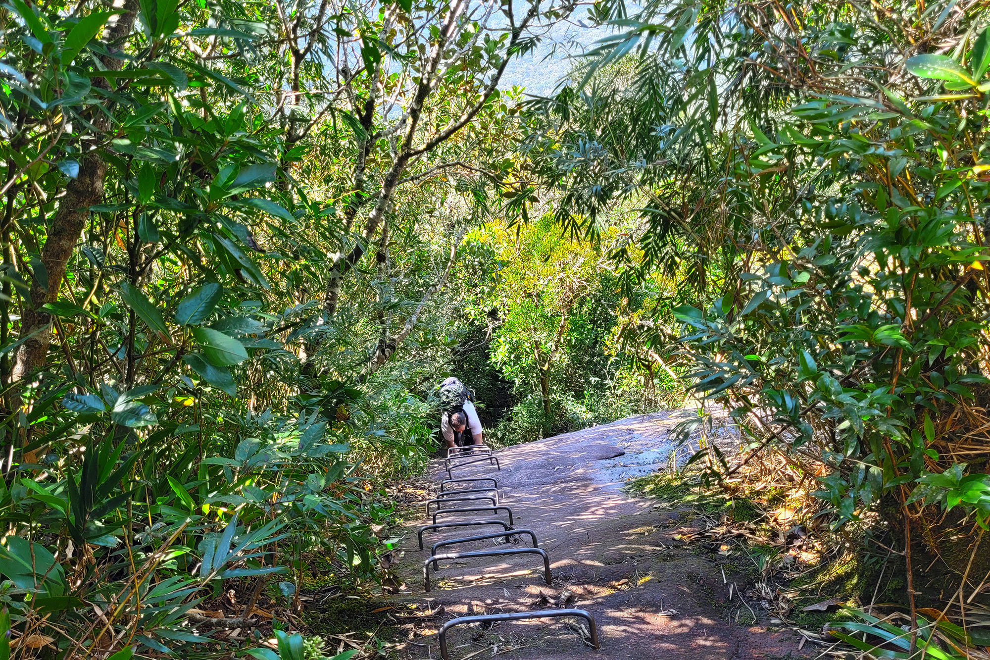 Ao subir o Abrolhos, você vai encarar uma trilha dividida em três momentos marcantes: primeiro, uma subida intensa pela floresta fechada; depois, um trecho misto de vegetação e rochas, onde o caminho já começa a se inclinar com força. Por fim, acima dos 1000 metros, o verde dá lugar à rocha pura — uma parede quase vertical que se vence com o auxílio dos degraus fixados na pedra. É desafio na medida certa, com uma vista de tirar o fôlego no final.