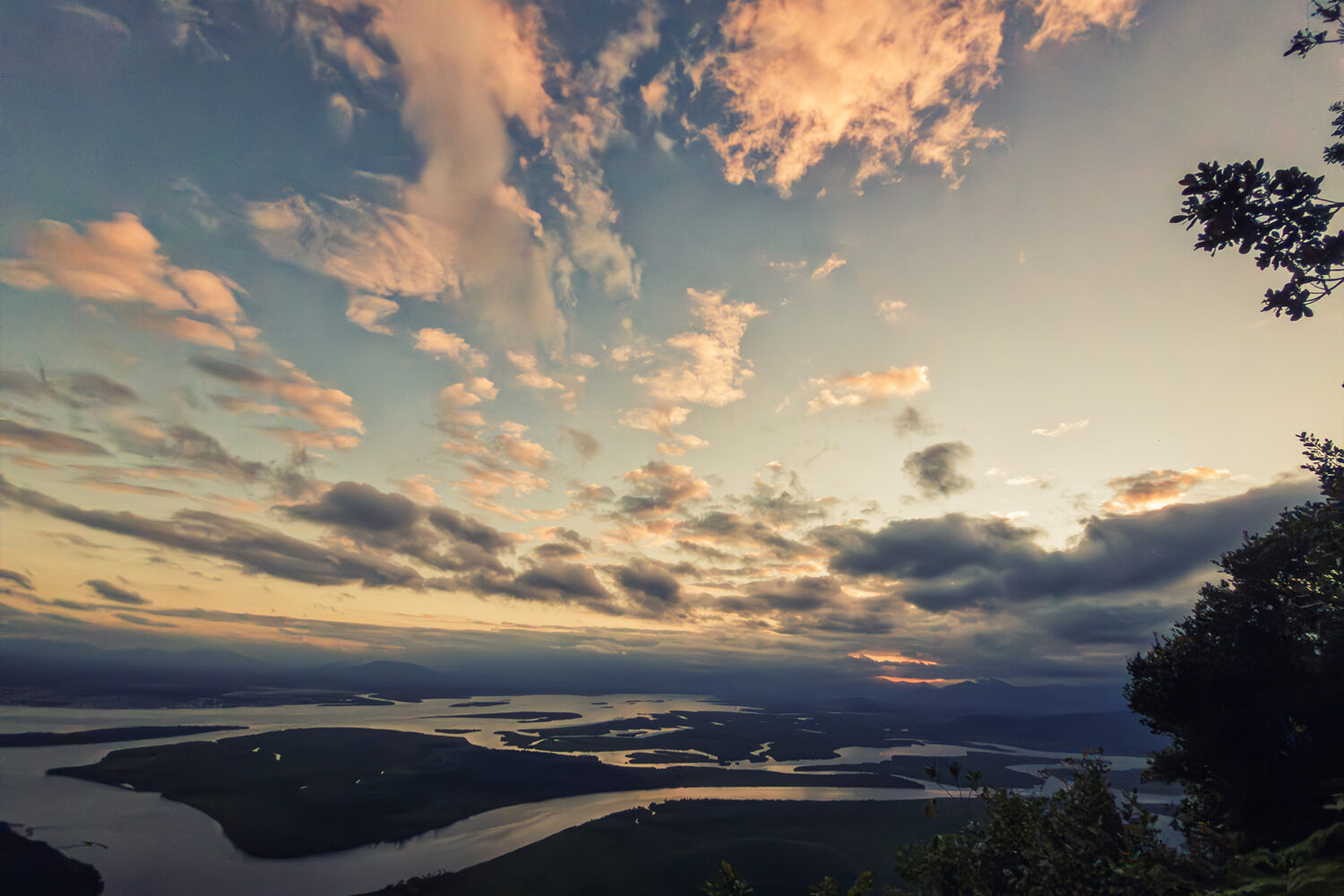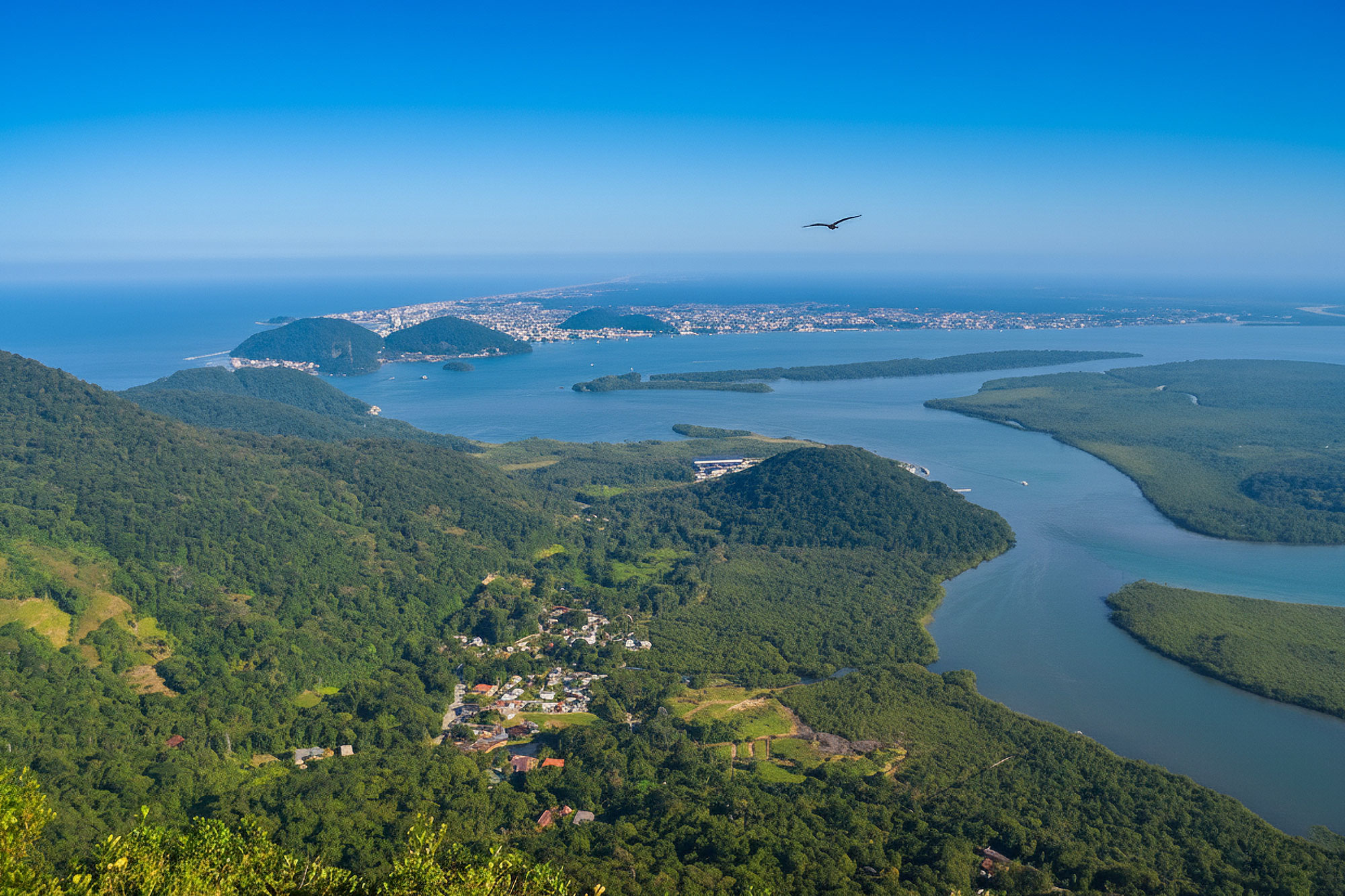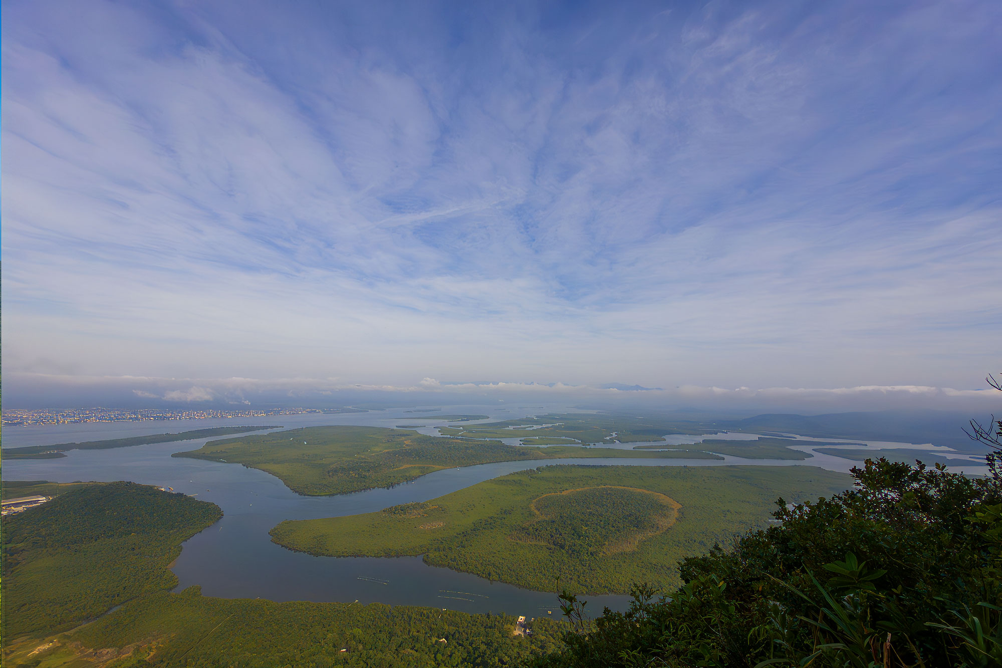 O cume do Morro do Cabaraquara tem vegetação alta que bloqueia a vista. Descemos cerca de 50m até uma janela com vista pro Estuário de Guaratuba — uma das mais belas do litoral paranaense.